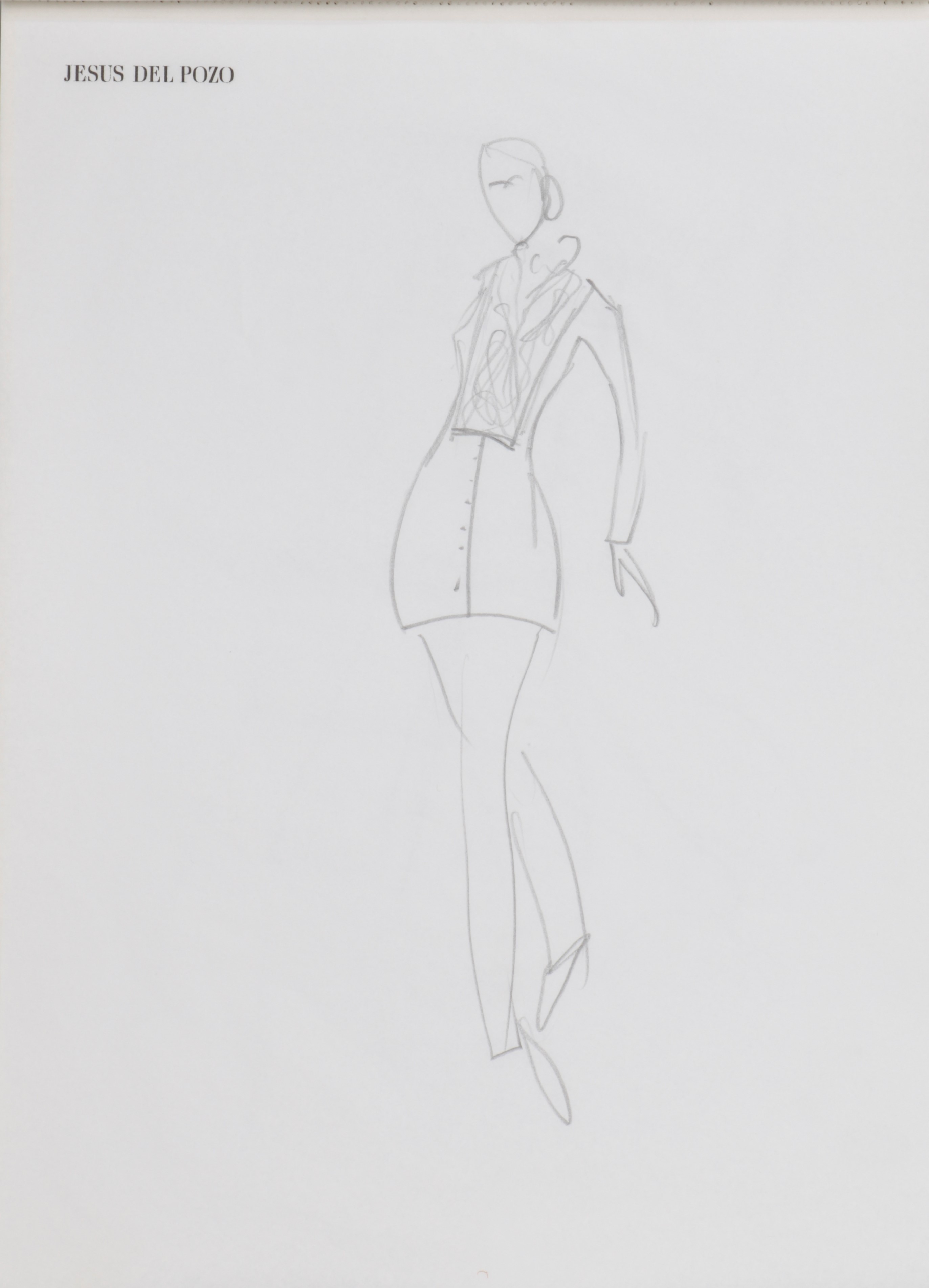 Este boceto de moda es fruto de la investigación de Casablanca en esta vertiente de su trabajo en el taller de Jesús del Pozo, como evidencia la impresión del nombre del diseñador en el área superior central del papel. El boceto está realizado a grafito y reproduce esquemáticamente la silueta de una mujer ataviada con pantalón y chaqueta larga abotonada en el centro delante, decorando con especial énfasis el espacio del escote.