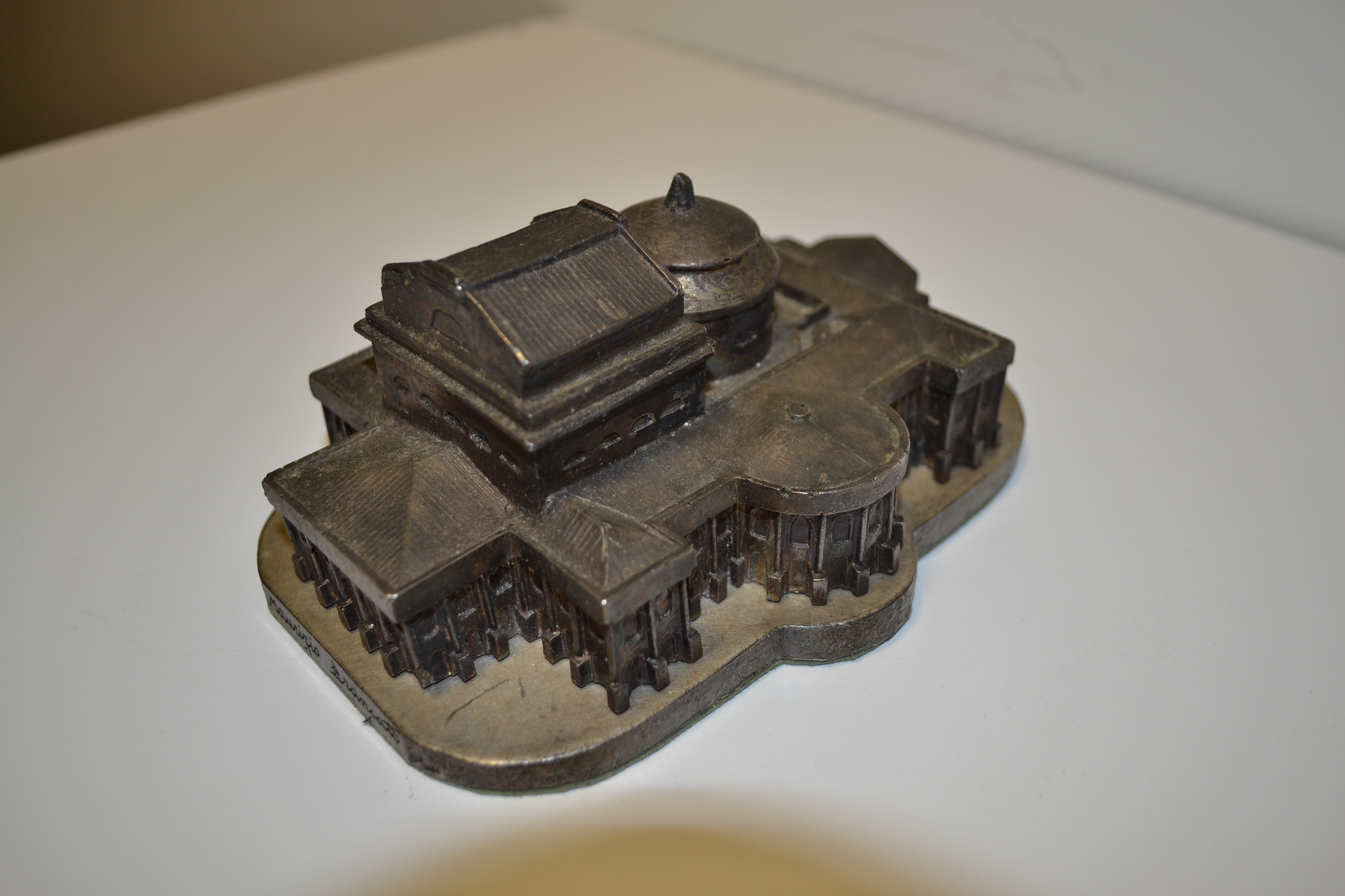 Una pieza de metal plateado realizada en bulto redondo realizada con gran minuciosidad ya que aparecen los elementos arquitectónicos muy detallados, representa el Teatro Massimo de Palermo.