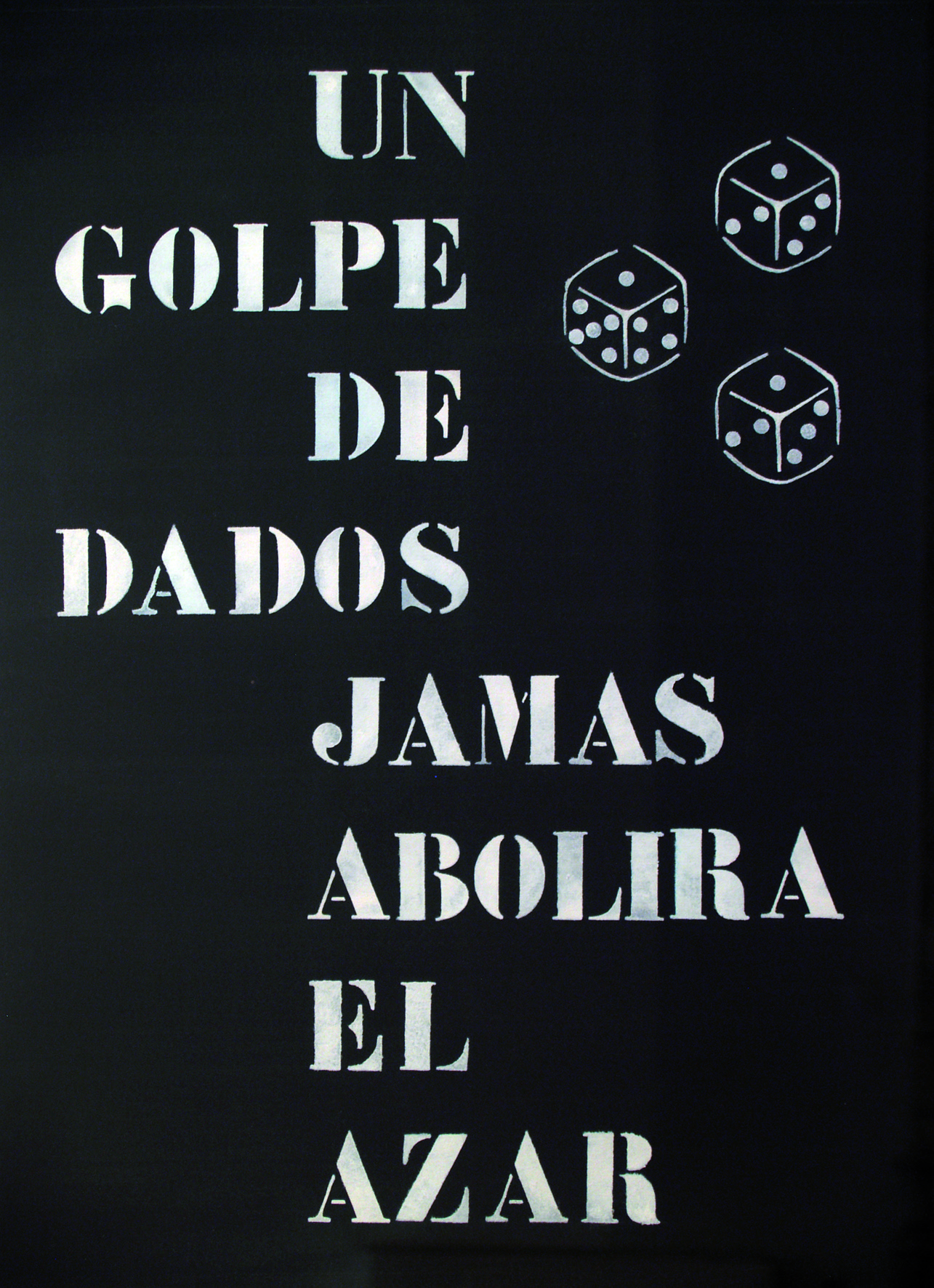 Composición vertical de fondo negro a la que, a través de la técnica del estarcido, se añade el texto “Un golpe de dados jamás abolirá el azar” y tres dados en la esquina superior derecha.