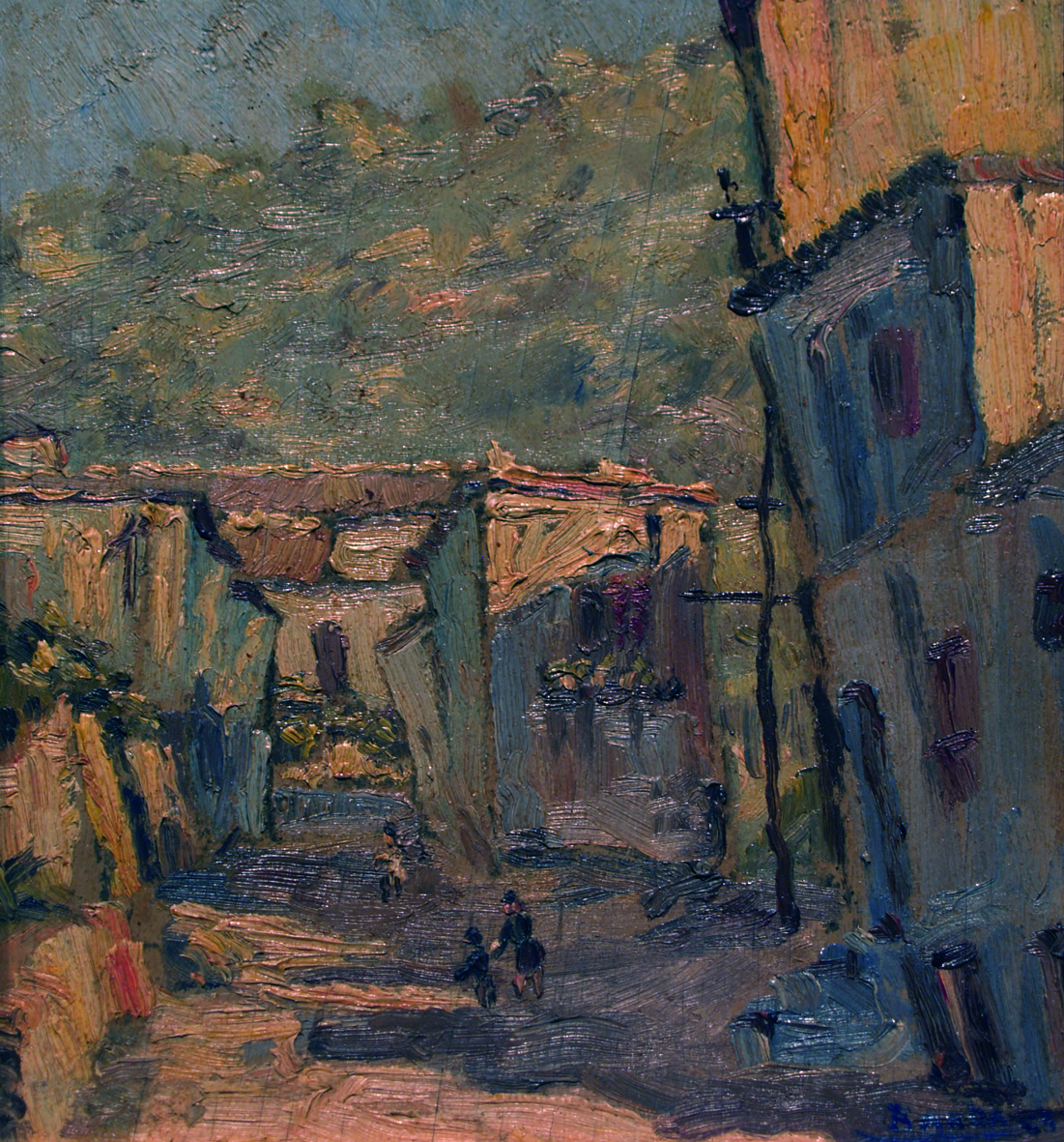 Paisaje rural en tonos ocres que representa una calle con diferentes viviendas y algunos transeúntes a través de una pincelada muy suelta.