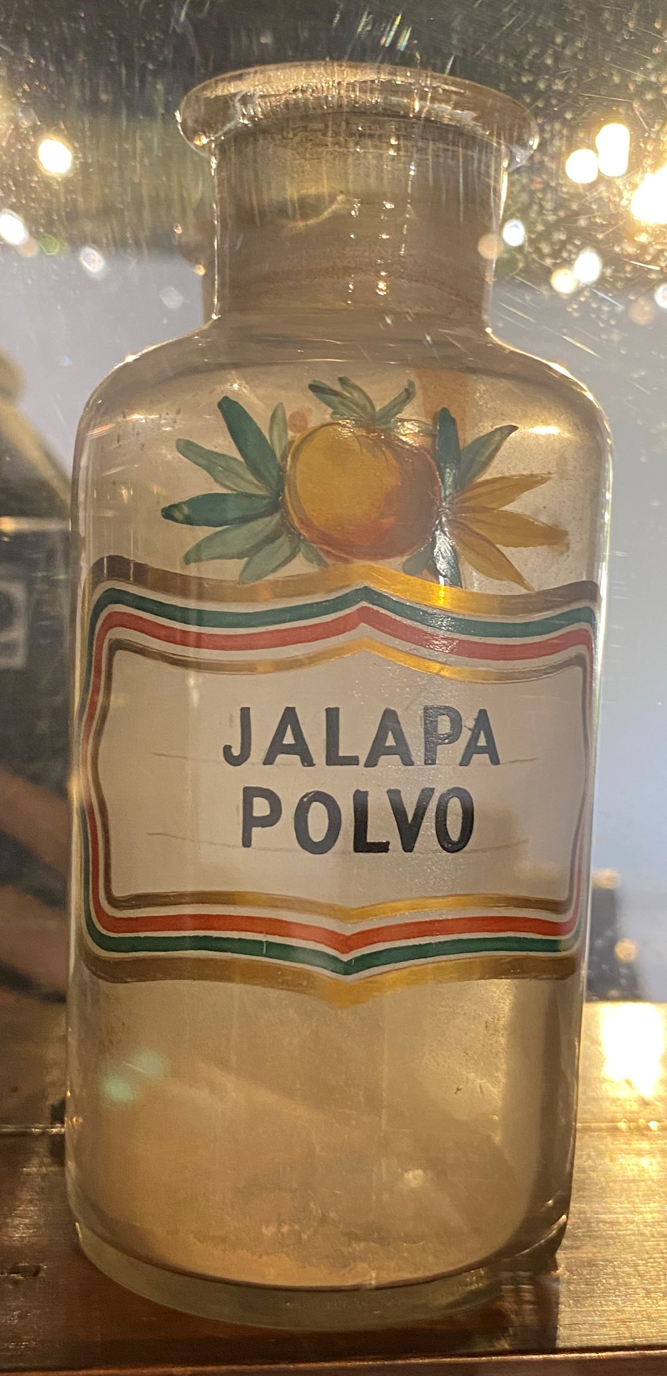Bote cilíndrico de vidrio transparente, cuello corto y boca estrecha con reborde plano que se cierra mediante un tapón realizado también en vidrio esmerilado transparente. Forma parte del conjunto de botes farmacéuticos de la Farmacia Zambrano, identificables todos ellos por contar con un mismo diseño decorativo de cartela que aparece pintada sobre el propio bote, con un fondo blanco donde aparece, en negro y en mayúsculas, el nombre de su contenido, en este caso “JALAPA POLVO”. Decoran el perímetro de la cartela mixtilínea cuatro franjas de color (dorado, rojo, verde y nuevamente dorado) que se intercalan con tres franjas blancas, siendo la última, dorada, algo más gruesa que el resto. Centrado sobre la cartela, un motivo vegetal formado por lo que parece ser una naranja con hojas en abanico a ambos lados remata la composición.