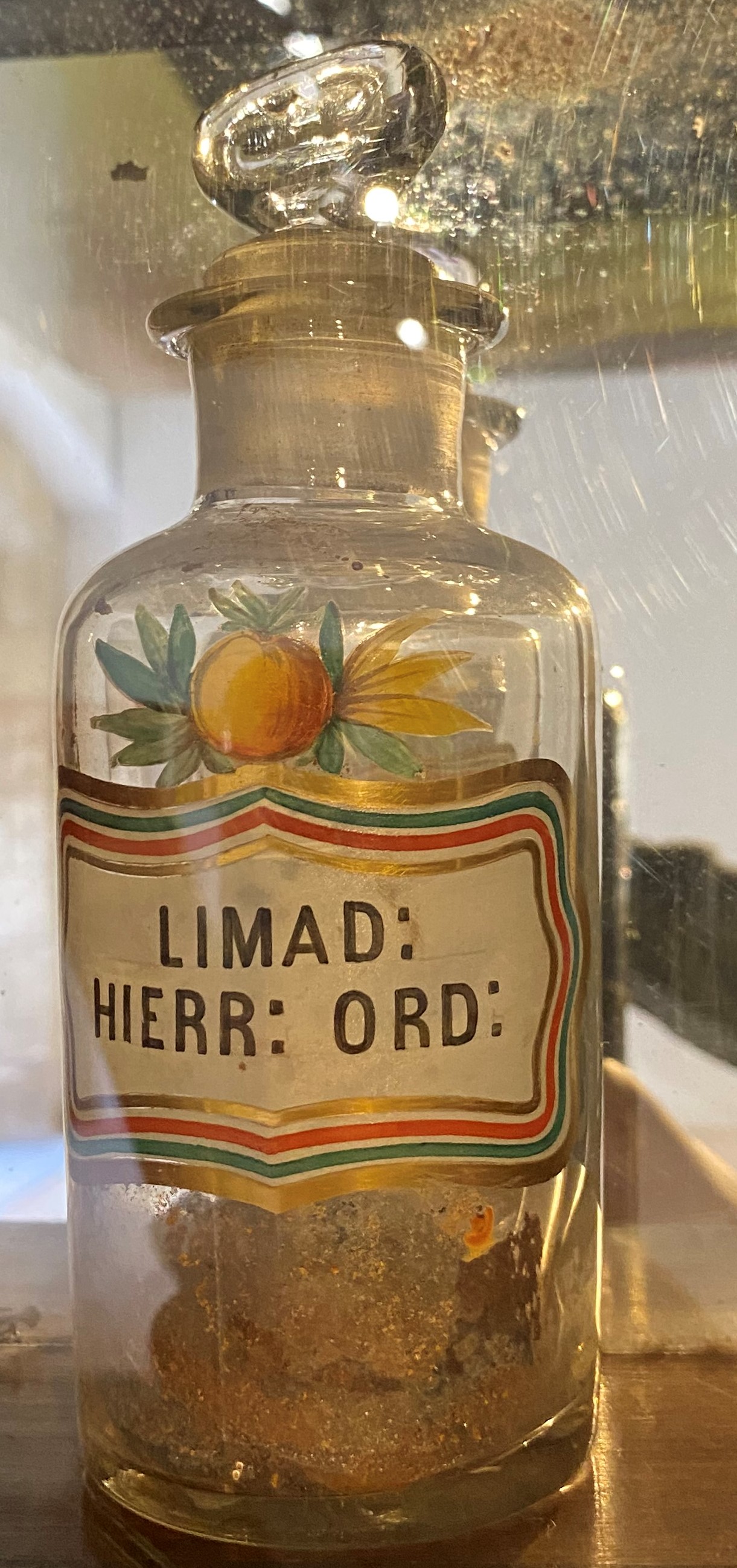 Bote cilíndrico de vidrio transparente, cuello corto y boca estrecha con reborde plano que se cierra mediante un tapón realizado también en vidrio esmerilado transparente. Forma parte del conjunto de botes farmacéuticos de la Farmacia Zambrano, identificables todos ellos por contar con un mismo diseño decorativo de cartela que aparece pintada sobre el propio bote, con un fondo blanco donde aparece, en negro y en mayúsculas, el nombre de su contenido, en este caso “LIMAD: HIERR: ORD:”. Decoran el perímetro de la cartela mixtilínea cuatro franjas de color (dorado, rojo, verde y nuevamente dorado) que se intercalan con tres franjas blancas, siendo la última, dorada, algo más gruesa que el resto. Centrado sobre la cartela, un motivo vegetal formado por lo que parece ser una naranja con hojas en abanico a ambos lados remata la composición.