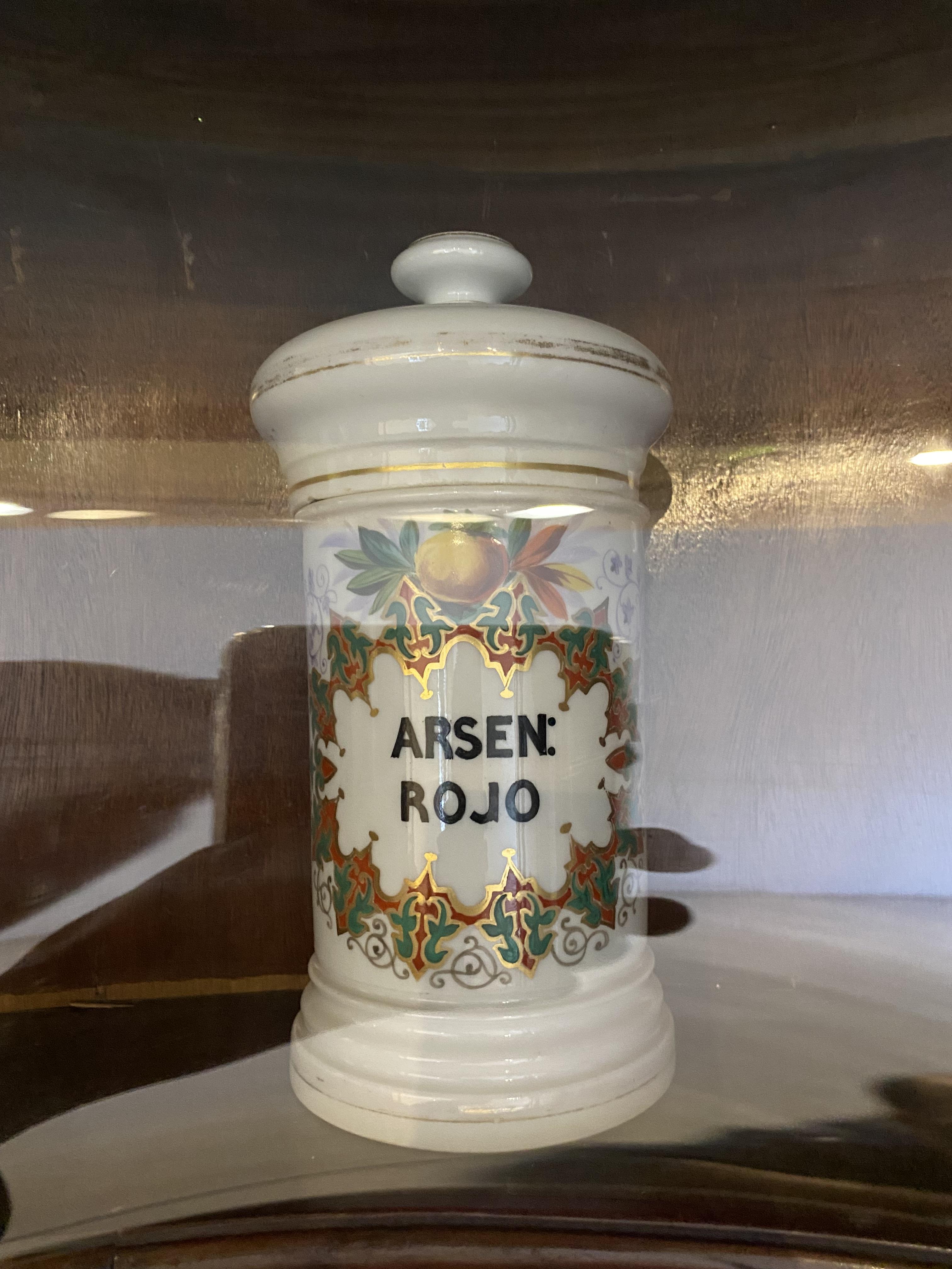 En el caso de estos últimos, la cartela, pintada sobre el propio albarelo, sigue una estructura ovalada en cuyo centro aparece, en negro y en mayúsculas, el nombre de su contenido “ARSEN: ROJO”; lo rodea una cenefa decorativa de aire arabesco con decoración vegetal esquemática en rojo minio y azul verdoso perfilada en dorado. En los huecos generados por esta orla hacia el exterior, en su mitad inferior, se intercalan una serie de motivos vegetales aislados de trazo muy fino en tono dorado grisáceo y, en los extremos superiores se desarrollan en una mayor estructura de ramas, hojas y flores de color violeta tenue. Centrado sobre la cartela, un motivo vegetal formado por lo que parece ser una naranja con hojas en abanico a ambos lados remata la composición.