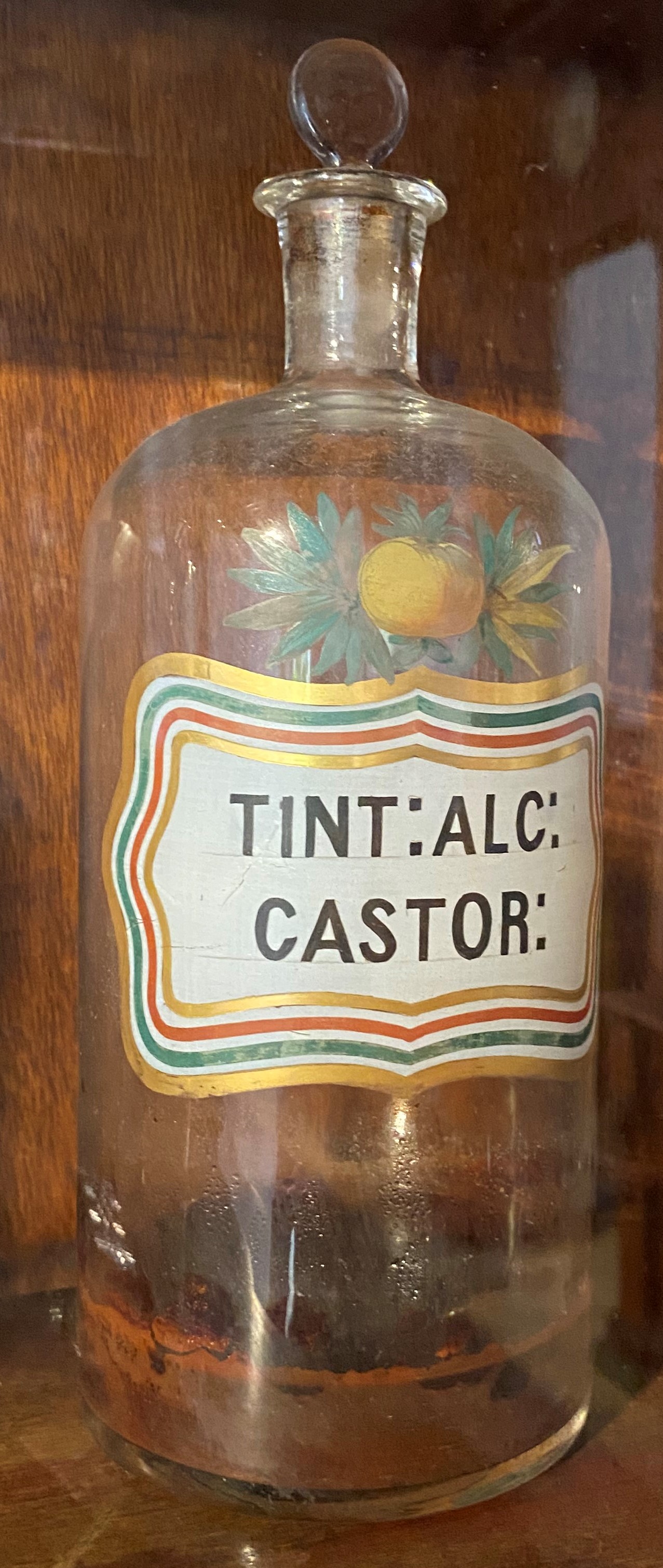 Bote cilíndrico de vidrio transparente, cuello corto y boca estrecha con reborde plano que se cierra mediante un tapón realizado también en vidrio esmerilado transparente. Forma parte del conjunto de botes farmacéuticos de la Farmacia Zambrano, identificables todos ellos por contar con un mismo diseño decorativo de cartela que aparece pintada sobre el propio bote, con un fondo blanco donde aparece, en negro y en mayúsculas, el nombre de su contenido, en este caso “TINT: ALC: CASTOR:”. Decoran el perímetro de la cartela mixtilínea cuatro franjas de color (dorado, rojo, verde y nuevamente dorado) que se intercalan con tres franjas blancas, siendo la última, dorada, algo más gruesa que el resto. Centrado sobre la cartela, un motivo vegetal formado por lo que parece ser una naranja con hojas en abanico a ambos lados remata la composición.