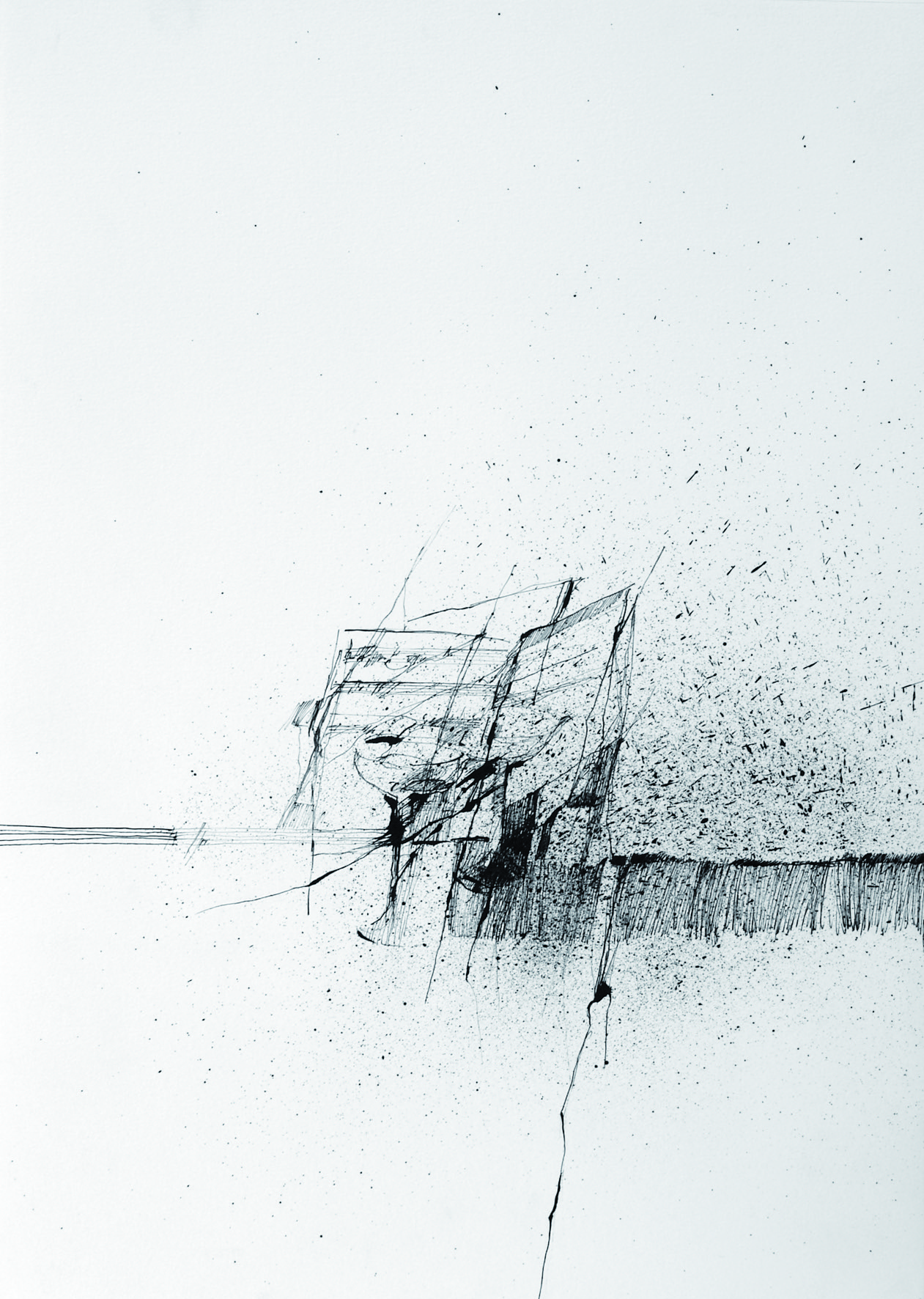 Composición abstracta en tinta china sobre fondo blanco. El punto focal se sitúa en el centro del soporte y se compone de trazos muy sueltos.