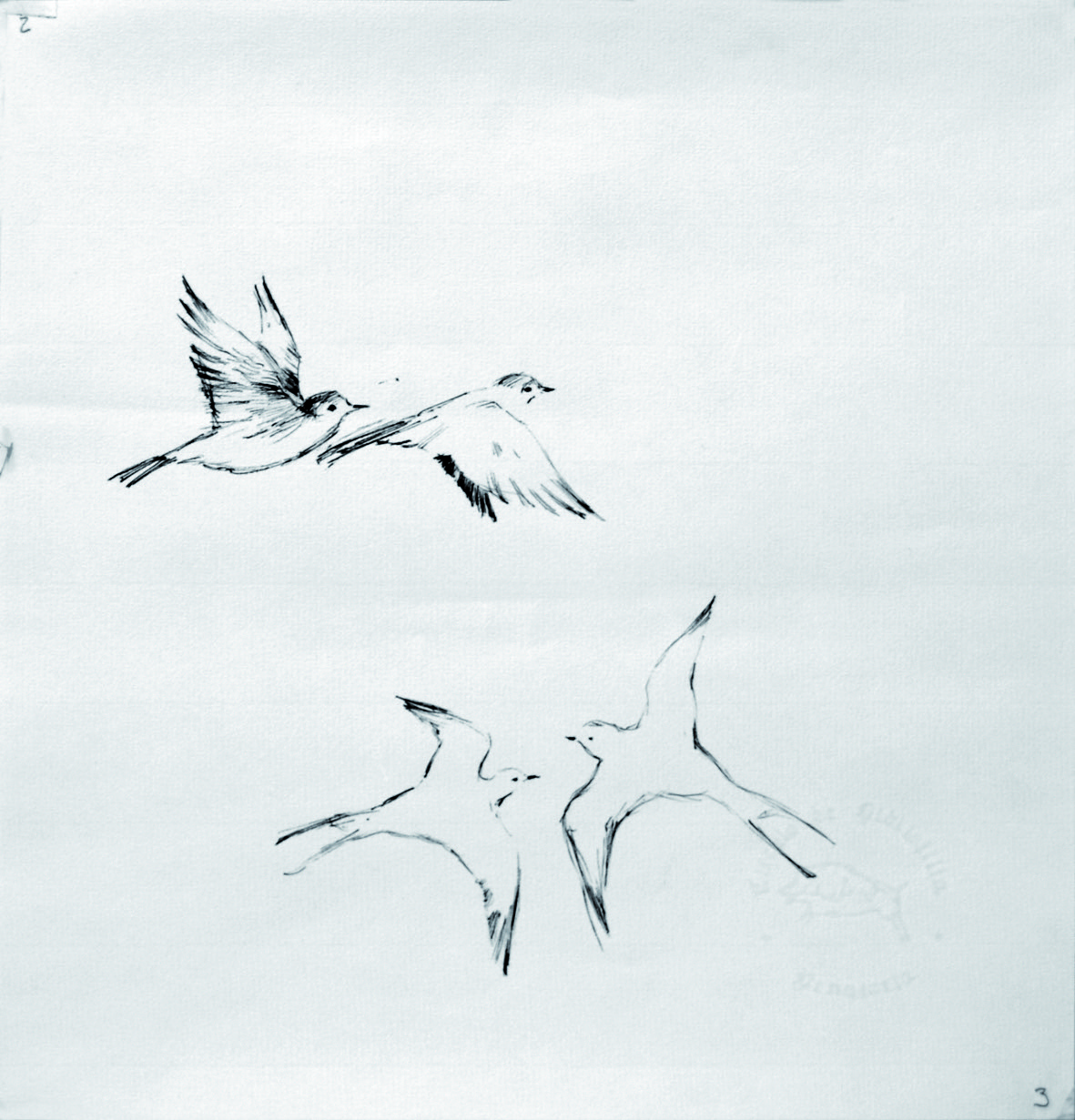 Ilustración compuesta por dos pares de aves. En la parte superior, dos aves más detalladas, desde una perspectiva lateral, en las que identificamos algunas plumas. En la inferior, dos aves desde una vista cenital. Ambas realizadas con tinta negra sobre fondo blanco.