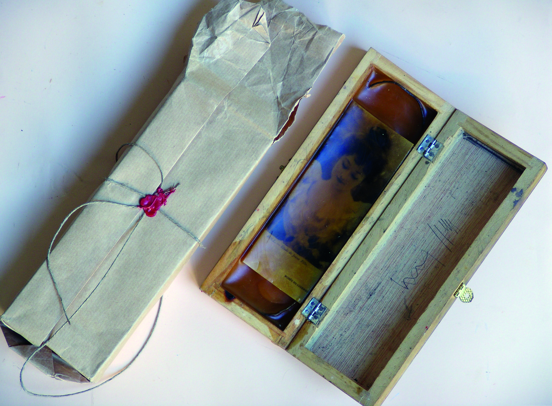 Caja de madera rectangular intervenida. En su interior parece haber sido encapsulado en resina un folleto del museo de Luxemburgo en el que vemos la fotografía del busto de una mujer con un vestido de mangas abullonadas y el cabello recogido. La caja presenta manchas de tinta y aceite.