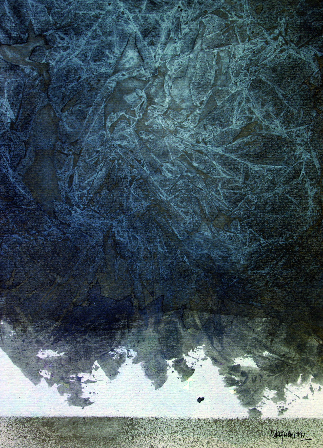 Composición abstracta con acrílico y tinta sobre papel. La mezcla de ambas técnicas crea una composición orgánica y dinámica al combinar el negro de la tinta con un blanco grisáceo del acrílico. La composición se desplaza a la parte superior, dejando una franja en la parte inferior con el papel visto.
